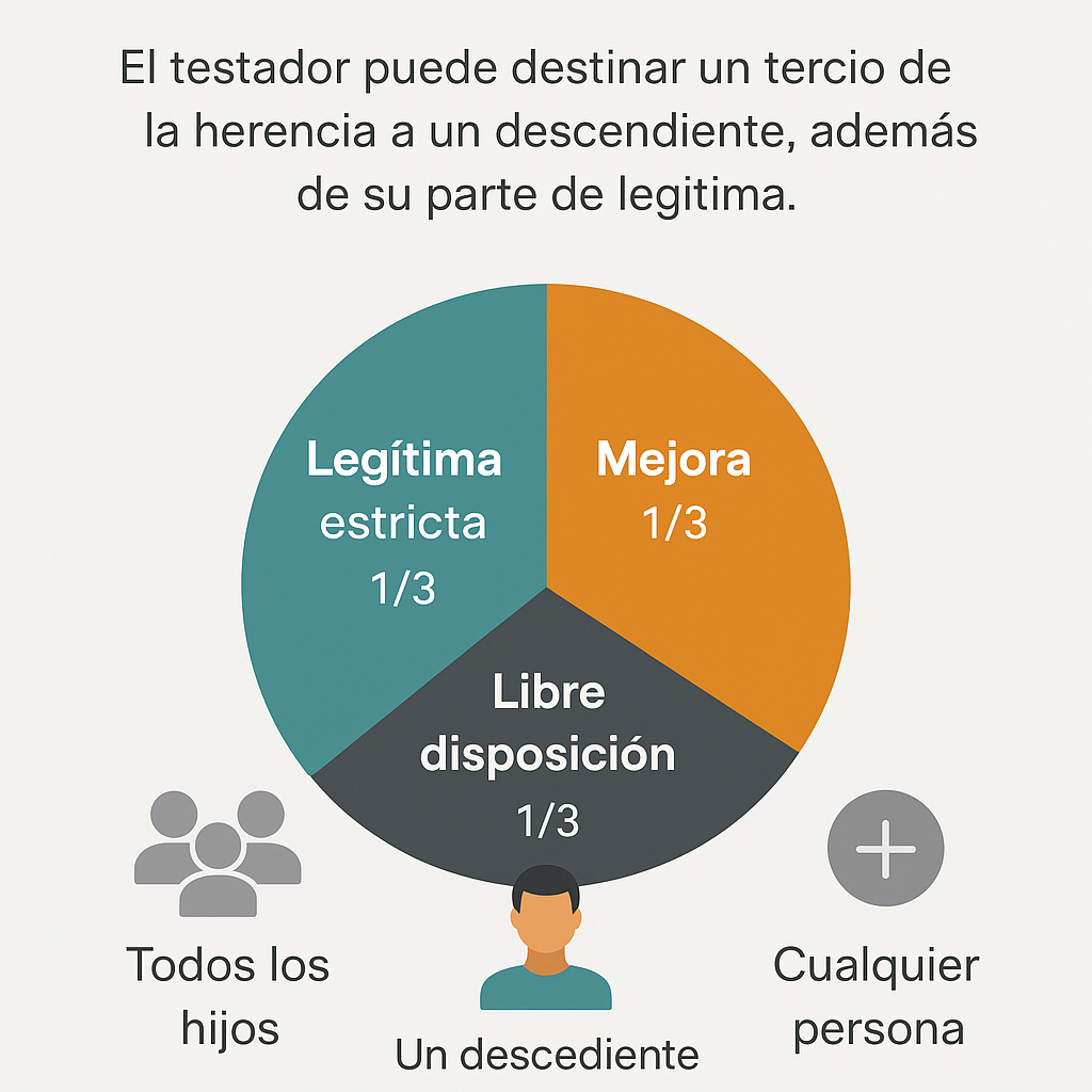La mejora testamentaria es el derecho que tiene el testador para destinar un tercio de la herencia (llamado tercio de mejora) a uno o varios de sus descendientes, repartiéndolo como quiera, sin necesidad de que sea en partes iguales.