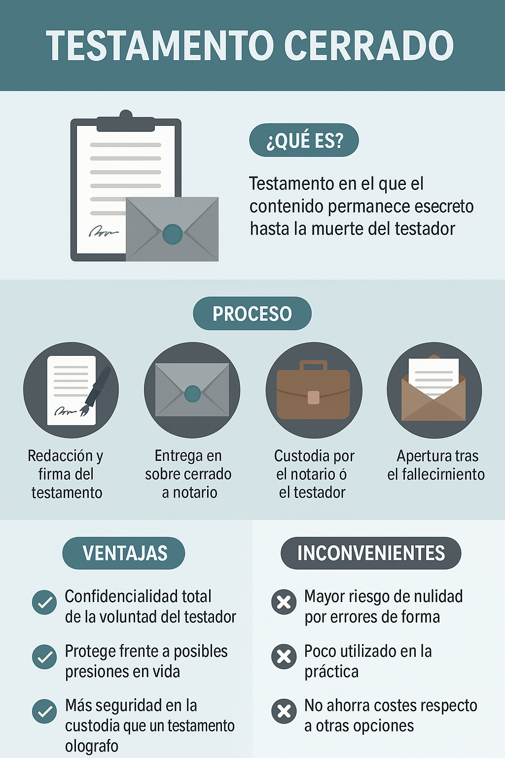 – Confidencialidad absoluta: El contenido solo se conoce tras el fallecimiento, protegiendo la privacidad del testador.