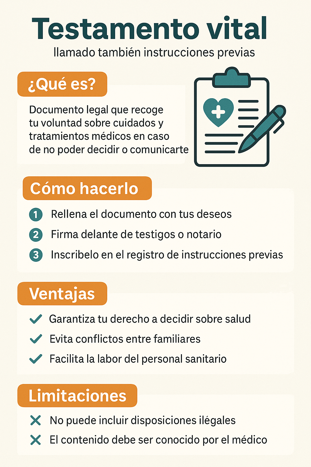 El testamento vital es un documento legal en el que una persona deja por escrito sus voluntades sobre los cuidados médicos, tratamientos y destino de su cuerpo u órganos para cuando, llegado el momento, no pueda expresarlas por sí misma.
